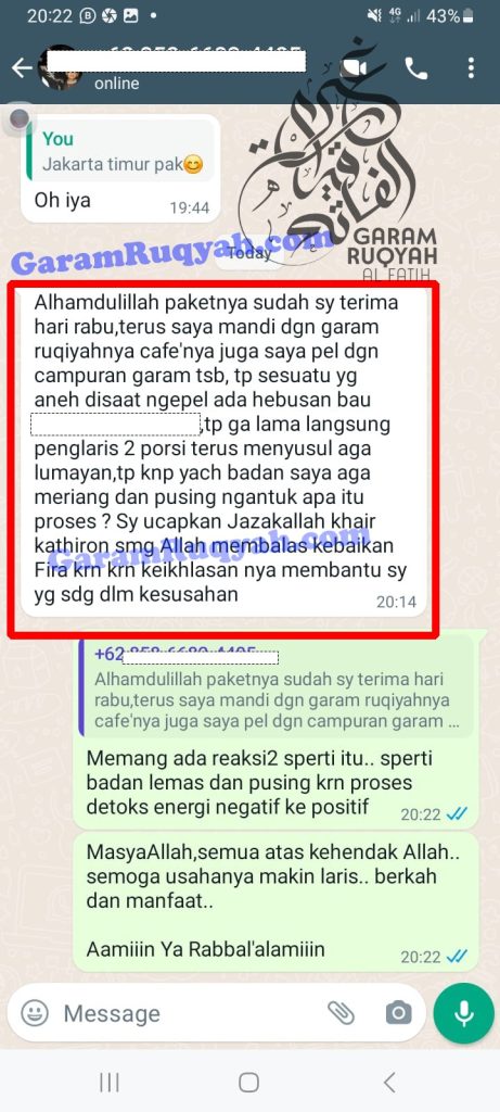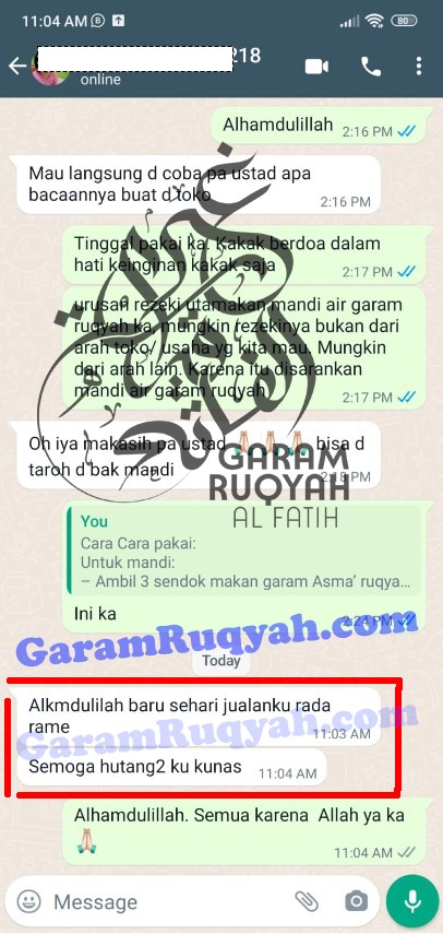 Garam Asma’ Ruqyah AL FATIH kemasan 750 Gram telah diasmak oleh peruqyah syari dengan ayat ayat ruqyah, seperti: Surah Al – Fatihah, Al-Ikhlas, Al-Falaq, An-Naas, Yunus 79-82, Thoha ayat 65-69, Al-Mu’minun ayat 115-118, Yassin 1-9, Ash-Shofat 1-10, Al-Mu’min ayat 1-3, Al-Ahqaf ayat 29-32, Ar-Rohman ayat 33-35, Al-Hasyr ayat 21-24, Al-Mulk ayat 1-4, Al-Isra ayat 82, Al-Kahfi ayat 39, Al-Qalam ayat 51-52, Surah Jin 1-9, Surah Al-Baqarah ayat 284-286.. dan seterusnya